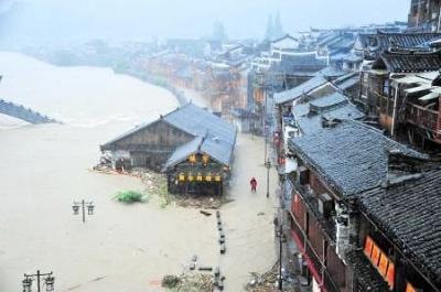 2014年7月15日,凤凰遭遇百年一遇的特大暴雨,凤凰古城段沱江水位猛涨,昔日安静和谐的“边城”,瞬间成为了一片泽国。古城景区被迫全部关闭,据凤凰县文物部门介绍,这次暴雨致使凤凰古城40余处文物古建筑受到洪水浸泡,部分县级保护文物受到损毁。